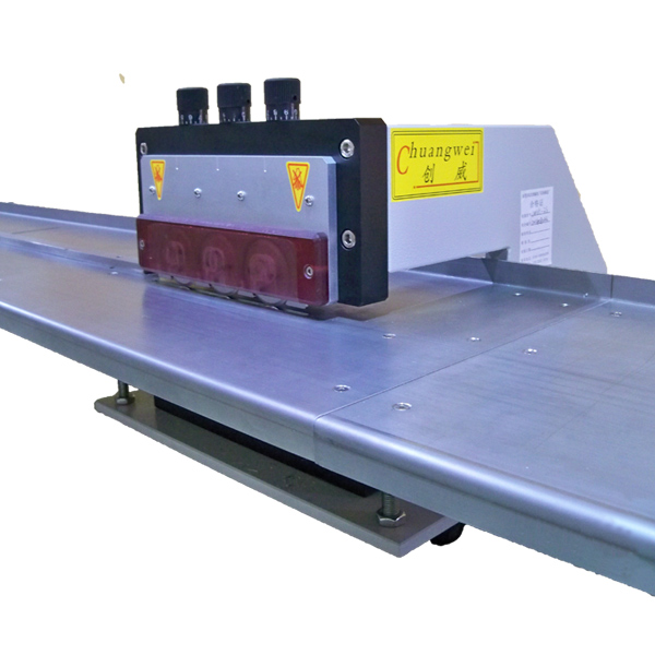 二,多刀式走板LED鋁基板分板機,CWVC-3S(此種分板機型號可以說是在CWVC-1S上進行的必要有利的改良,能更好的保證分板的變形度,控制分板應力,減小分板機刀片的磨損等,特別擅長于分切各種長的LED鋁基板,如0.8m,1.2m,2m,4m等LED鋁基板,至今為至此型號已成功用于中山,天津,江蘇等地的多家LED行業客戶。配備有標準的1.2米平臺及2.4米平臺供選擇。)